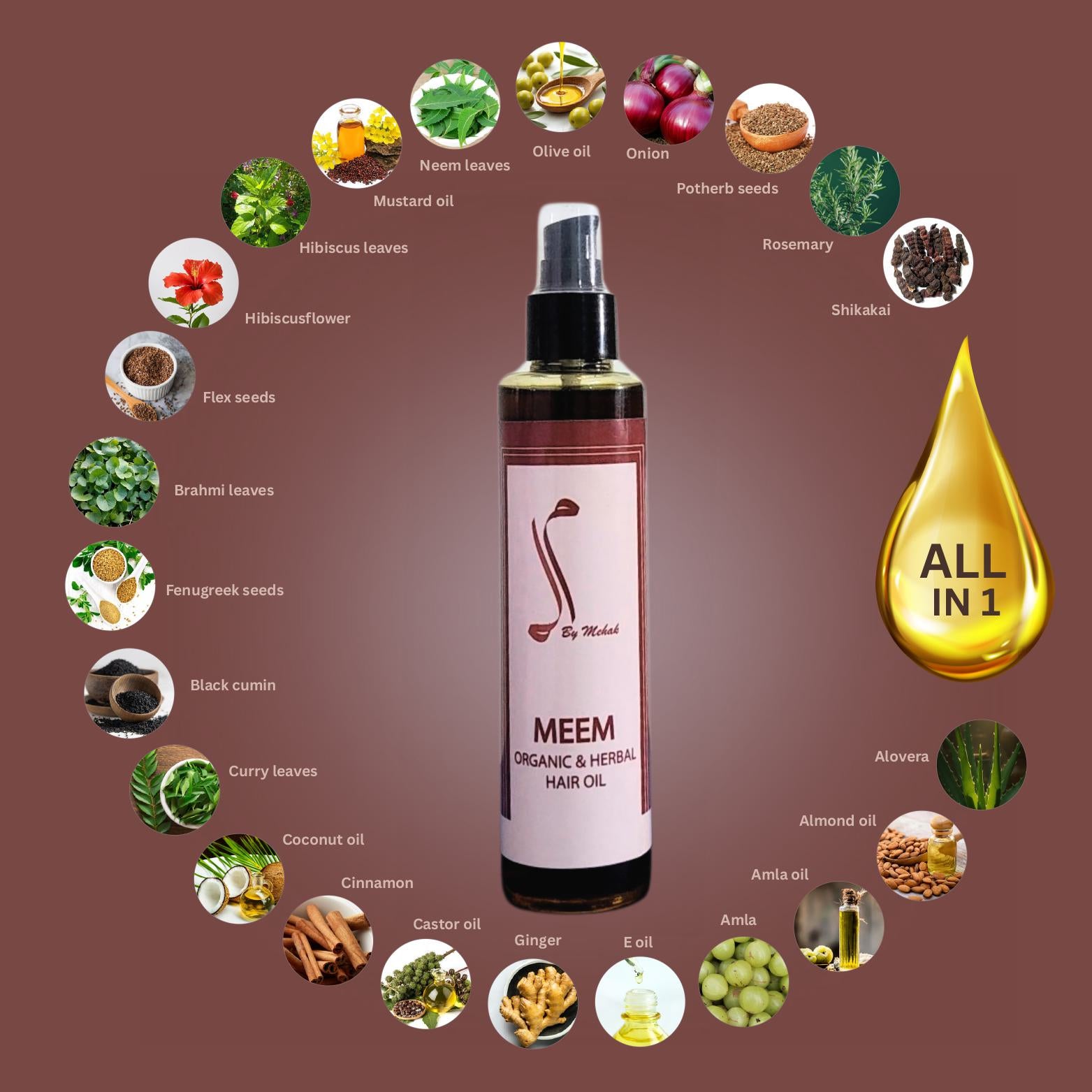 Experience the power of nature with MEEM Organic & Herbal Hair Oil - a premium blend of pure, natural ingredients designed to nourish your scalp, strengthen roots, and promote healthy hair growth. Handcrafted with love and blacked by herbal traditions, this oil is your all-in-one solution to hair fall, dandruff, dryness, and thinning.